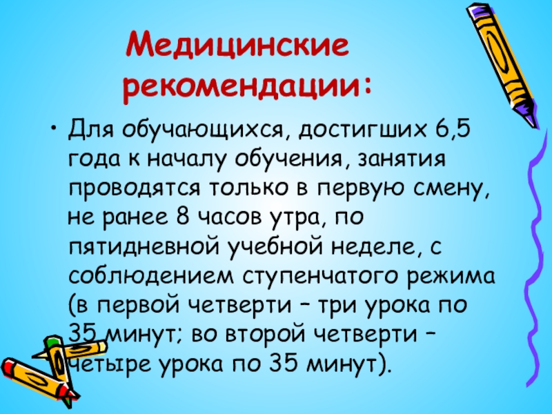только в первую смену, не ранее 8 часов утра, по пятидневной учебной неделе, с соблюдением ступенчатого режима (в первой четверти – три урока по 35 минут; во второй четверти – четыре урока по 35 минут).