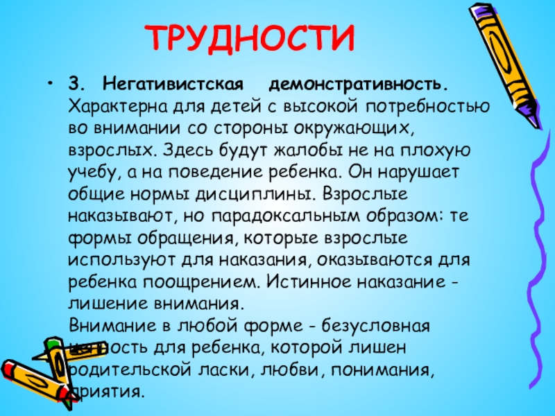 значительными трудностями. У них отмечаются негативные формы поведения, резкое проявление отрицательных эмоций, они с большим трудом усваивают учебные программы. Именно на таких детей чаще всего жалуются учителя: они "мешают" работать в классе.