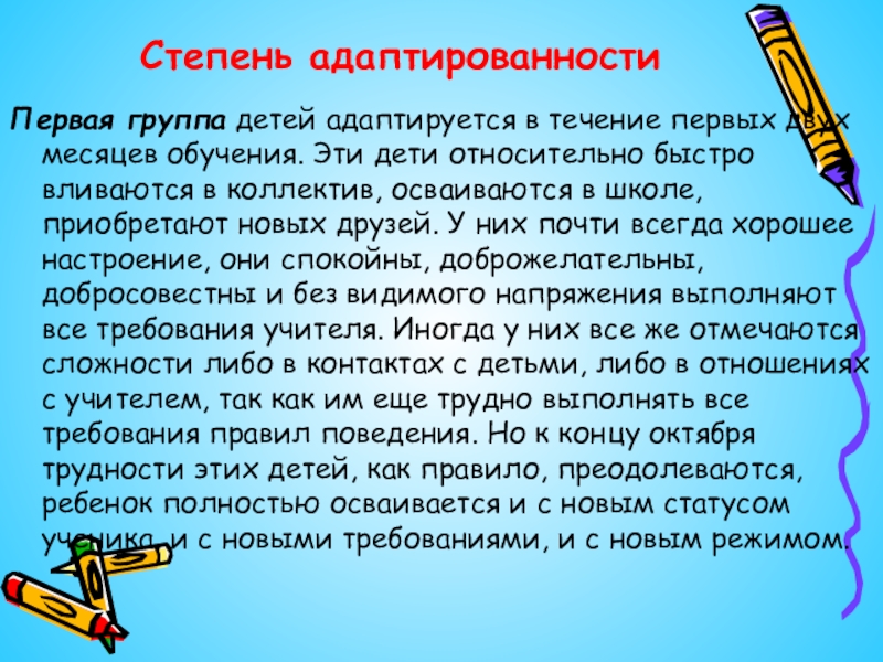 Первая группа детей адаптируется в течение первых двух месяцев обучения.