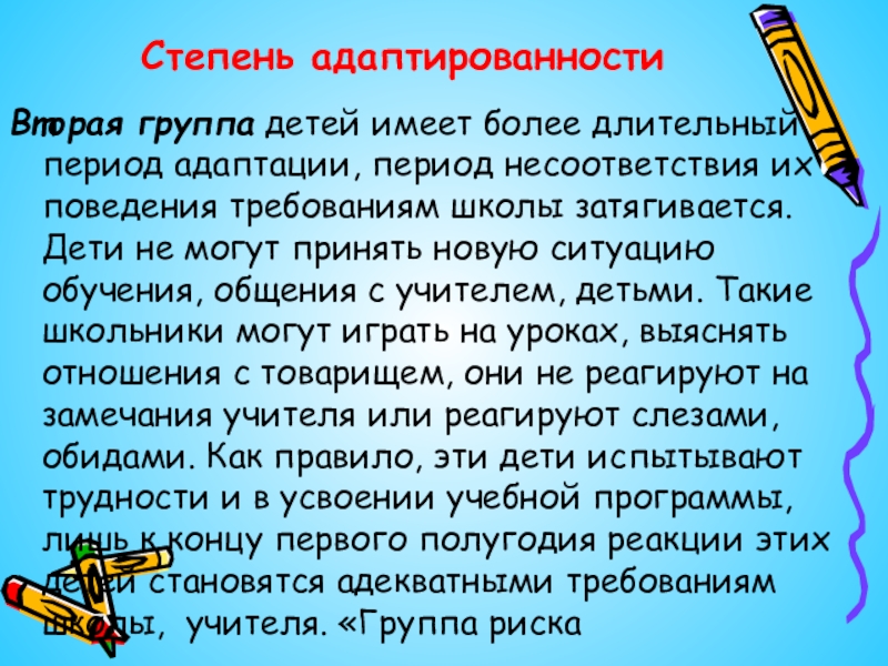 их поведения требованиям школы затягивается. Дети не могут принять новую ситуацию обучения, общения с учителем, детьми. Такие школьники могут играть на уроках, выяснять отношения с товарищем, они не реагируют на замечания учителя или реагируют слезами, обидами. Как правило, эти дети испытывают трудности и в усвоении учебной программы, лишь к концу первого полугодия реакции этих детей становятся адекватными требованиям школы, учителя. «Группа риска