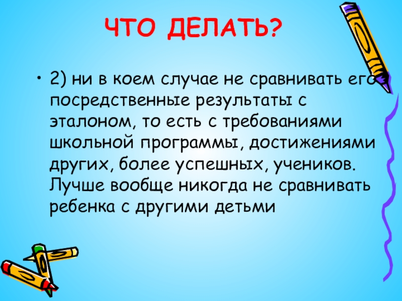с эталоном, то есть с требованиями школьной программы, достижениями других, более успешных, учеников. Лучше вообще никогда не сравнивать ребенка с другими детьми