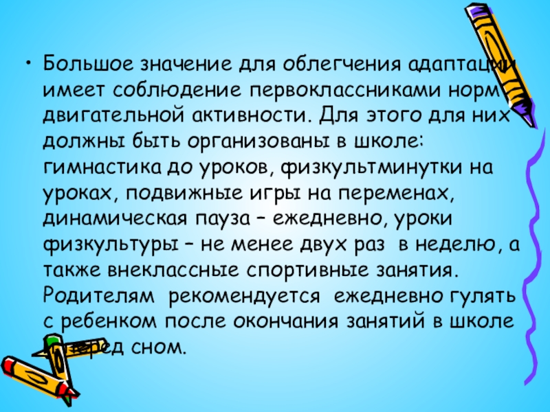 Большое значение для облегчения адаптации имеет соблюдение первоклассниками норм двигательной активности.
