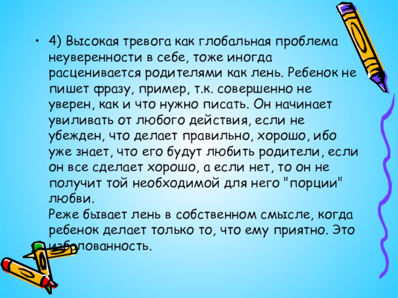 3) общая замедленность темпа деятельности, связанная с особенностями темперамента. Ребенок трудится добросовестно, но медленно, и родителям кажется, что ему "ЛЕНЬ ШЕВЕЛИТЬСЯ", они начинают его подгонять, раздражаются, проявляют недовольство, а ребенок в это время чувствует, что он не нужен, что он плохой. Возникает тревога, которая дезорганизация деятельности.