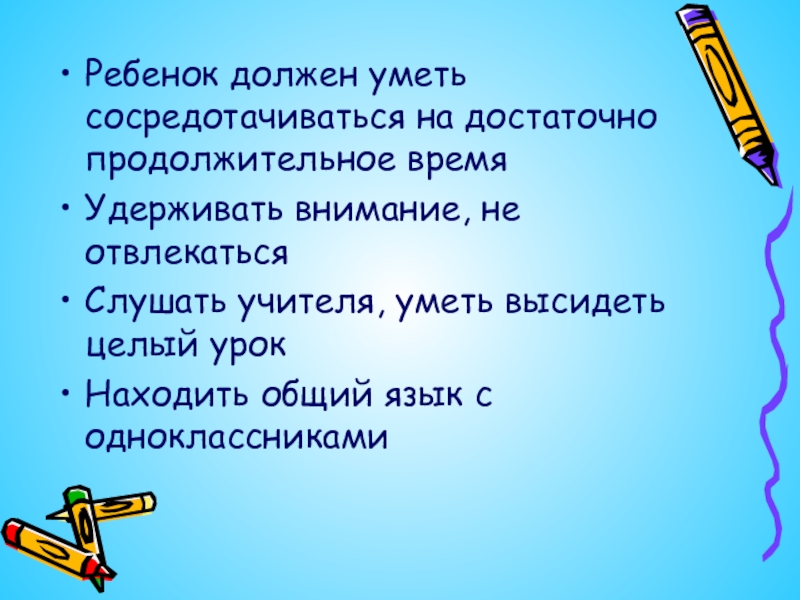 Ребенок должен уметь сосредотачиваться на достаточно продолжительное время