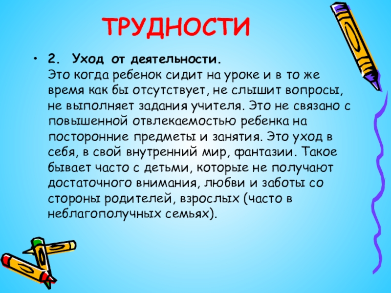 в то же время как бы отсутствует, не слышит вопросы, не выполняет задания учителя. Это не связано с повышенной отвлекаемостью ребенка на посторонние предметы и занятия. Это уход в себя, в свой внутренний мир, фантазии. Такое бывает часто с детьми, которые не получают достаточного внимания, любви и заботы со стороны родителей, взрослых (часто в неблагополучных семьях).