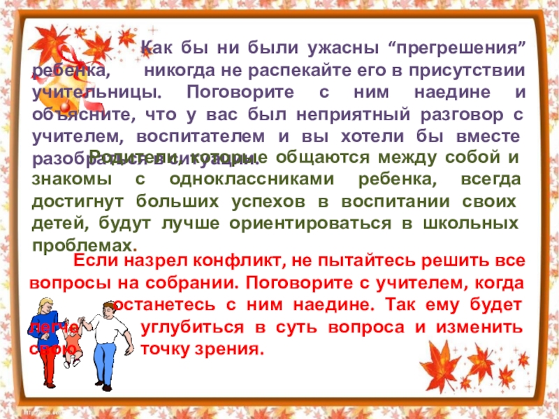 Если назрел конфликт, не пытайтесь решить все вопросы на собрании. Поговорите с учителем, когда останетесь с ним наедине. Так ему будет легче углубиться в суть вопроса и изменить свою точку зрения.