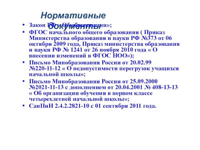 Письмо Минобразования России от 25.09.2000 №2021-11-13 с дополнением от 20.04.2001 № 408-13-13 « Об организации обучения в первом классе четырехлетней начальной школы»;