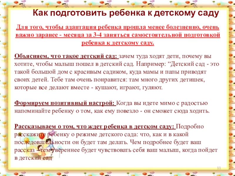 Объясняем, что такое детский сад: зачем туда ходят дети, почему вы хотите, чтобы малыш пошел в детский сад. Например: “Детский сад - это такой большой дом с красивым садиком, куда мамы и папы приводят своих детей. Тебе там очень понравится: там много других детишек, которые все делают вместе - кушают, играют, гуляют.