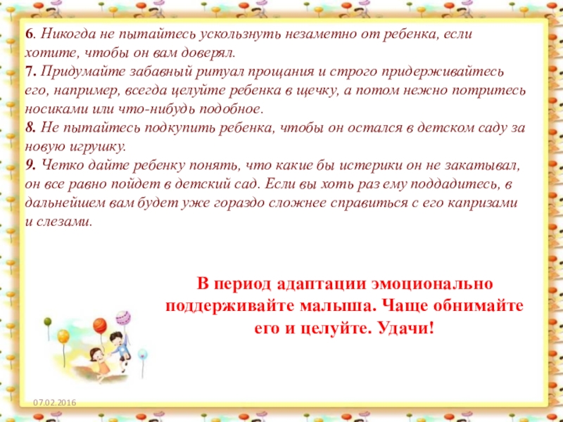 9. Четко дайте ребенку понять, что какие бы истерики он не закатывал, он все равно пойдет в детский сад. Если вы хоть раз ему поддадитесь, в дальнейшем вам будет уже гораздо сложнее справиться с его капризами и слезами.