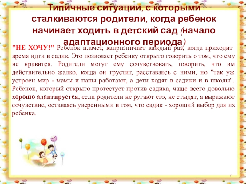 "НЕ ХОЧУ!" Ребенок плачет, капризничает каждый раз, когда приходит время идти в садик. Это позволяет ребенку открыто говорить о том, что ему не нравится. Родители могут ему сочувствовать, говорить, что им действительно жалко, когда он грустит, расставаясь с ними, но "так уж устроен мир - мамы и папы работают, а дети ходят в садики и в школы". Ребенок, который открыто протестует против садика, чаще всего довольно хорошо адаптируется, если родители не ругают его, не стыдят, а выражают сочувствие, оставаясь уверенными в том, что садик - хороший выбор для их ребенка.