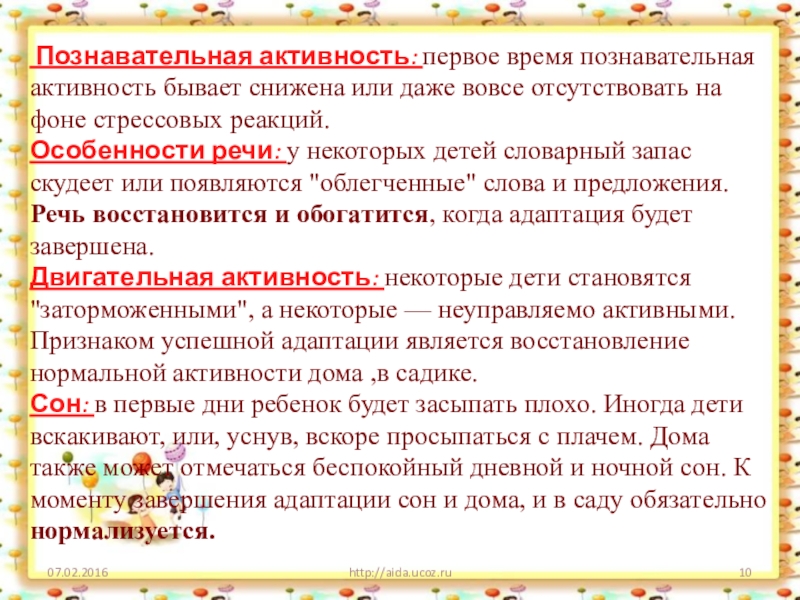 Двигательная активность: некоторые дети становятся "заторможенными", а некоторые — неуправляемо активными. Признаком успешной адаптации является восстановление нормальной активности дома ,в садике.