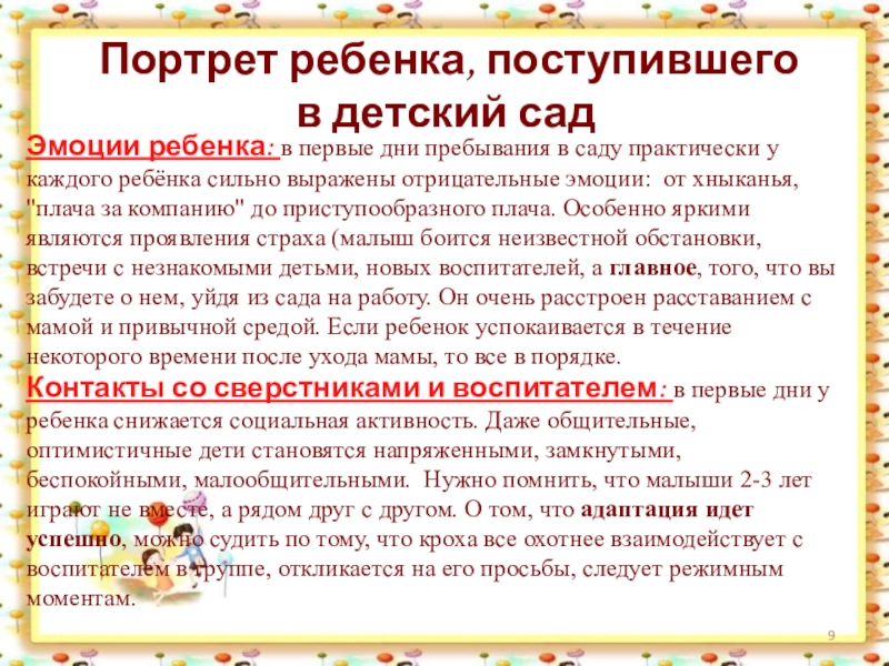 пребывания в саду практически у каждого ребёнка сильно выражены отрицательные эмоции: от хныканья, "плача за компанию" до приступообразного плача. Особенно яркими являются проявления страха (малыш боится неизвестной обстановки, встречи с незнакомыми детьми, новых воспитателей, а главное, того, что вы забудете о нем, уйдя из сада на работу. Он очень расстроен расставанием с мамой и привычной средой. Если ребенок успокаивается в течение некоторого времени после ухода мамы, то все в порядке.