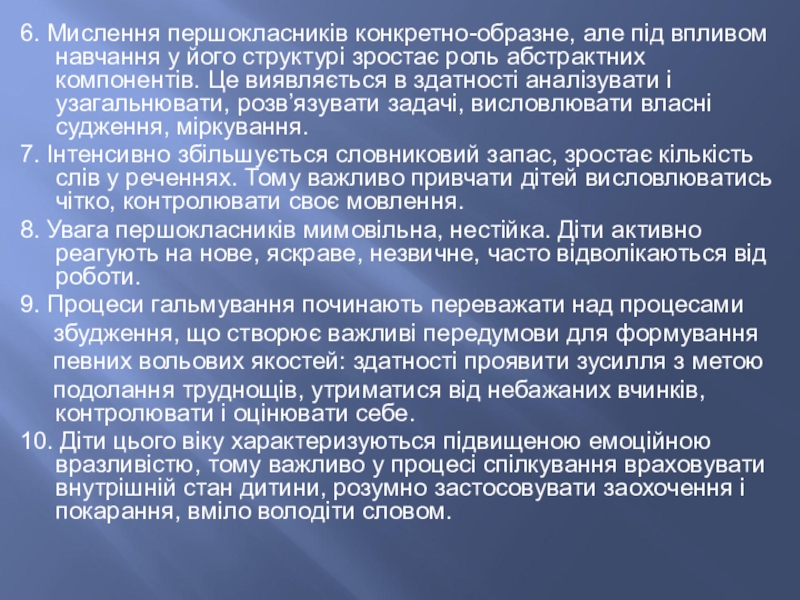10. Діти цього віку характеризуються підвищеною емоційною вразливістю, тому важливо у процесі спілкування враховувати внутрішній стан дитини, розумно застосовувати заохочення і покарання, вміло володіти словом.
