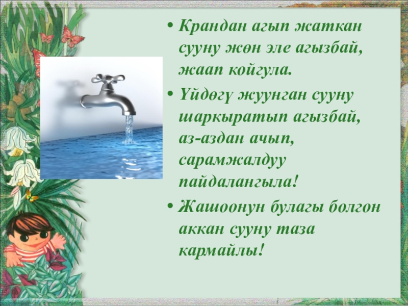 Слайд 40Крандан агып жаткан сууну жөн эле агызбай, жаап койгула.