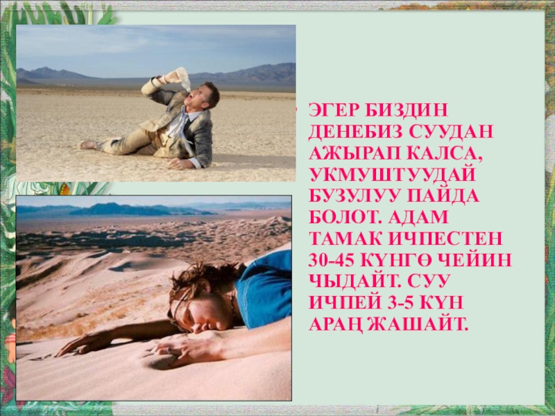 Слайд 20Эгер биздин денебиз суудан ажырап калса,укмуштуудай бузулуу пайда болот. Адам тамак