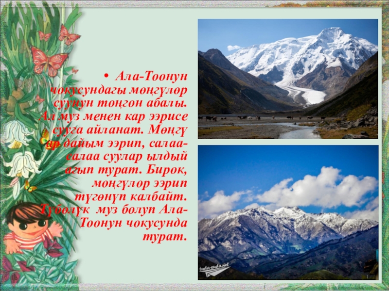 Слайд 23Ала-Тоонун чокусундагы мөңгүлөр суунун тоңгон абалы. Ал муз менен кар ээрисе