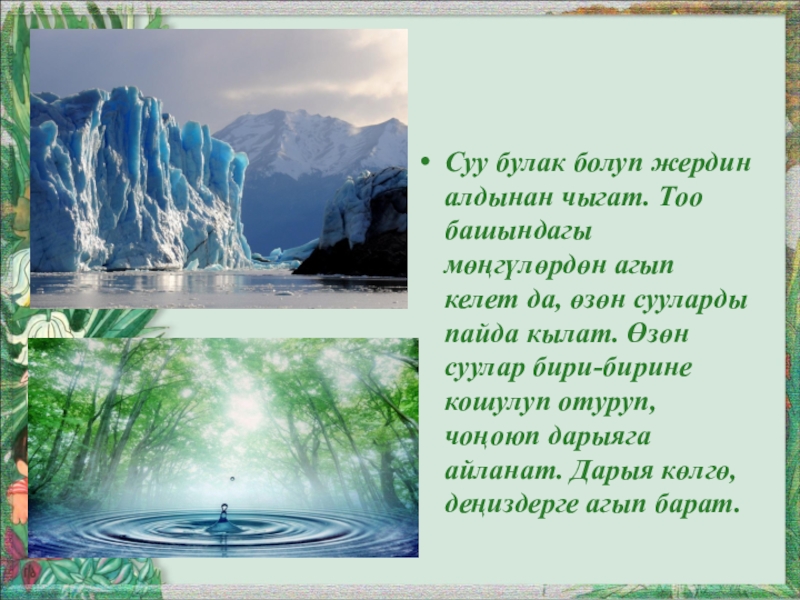 Слайд 22Суу булак болуп жердин алдынан чыгат. Тоо башындагы мөңгүлөрдөн агып келет