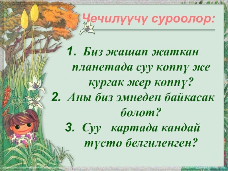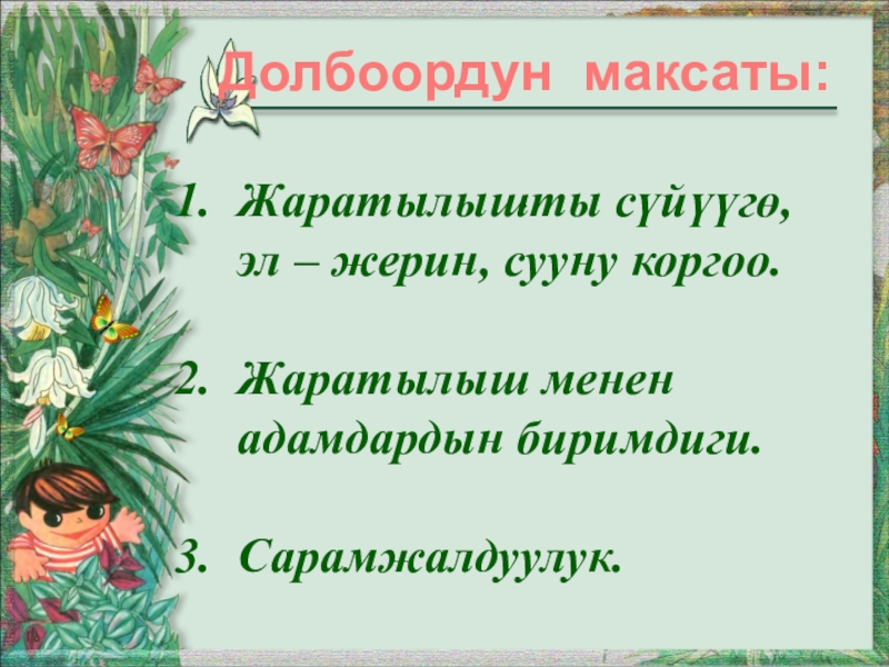Жаратылышты сүйүүгө, эл – жерин, сууну коргоо.