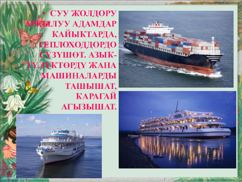 Слайд 15Суу жолдору аркылуу адамдар кайыктарда, теплоходдордо сүзүшөт. Азык-түлүктөрдү жана машиналарды ташышат,