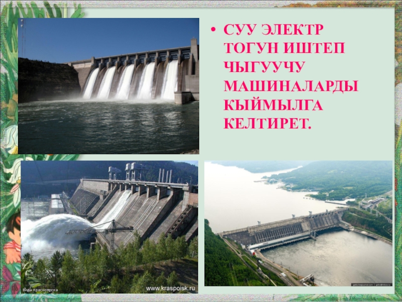 Слайд 16Суу электр тогун иштеп чыгуучу машиналарды кыймылга келтирет.