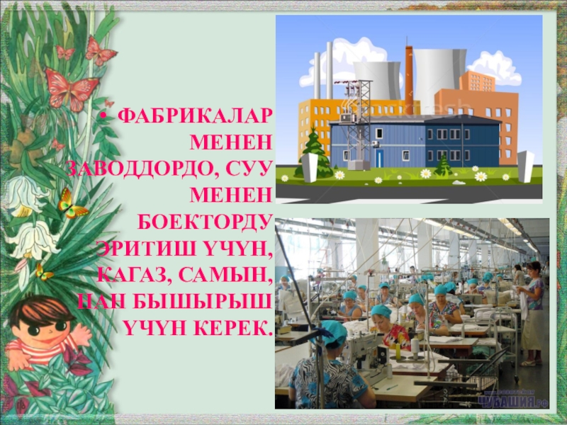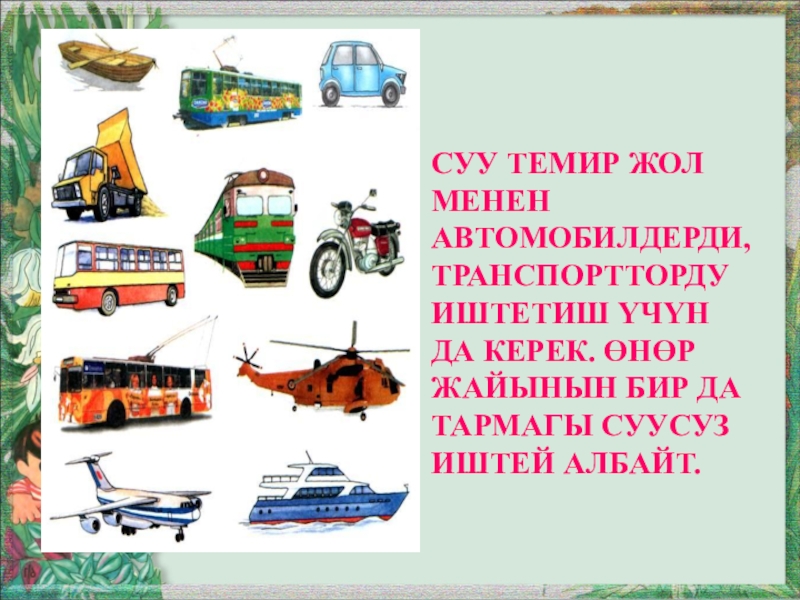 Слайд 18Суу темир жол менен автомобилдерди, транспортторду иштетиш үчүн да керек. Өнөр