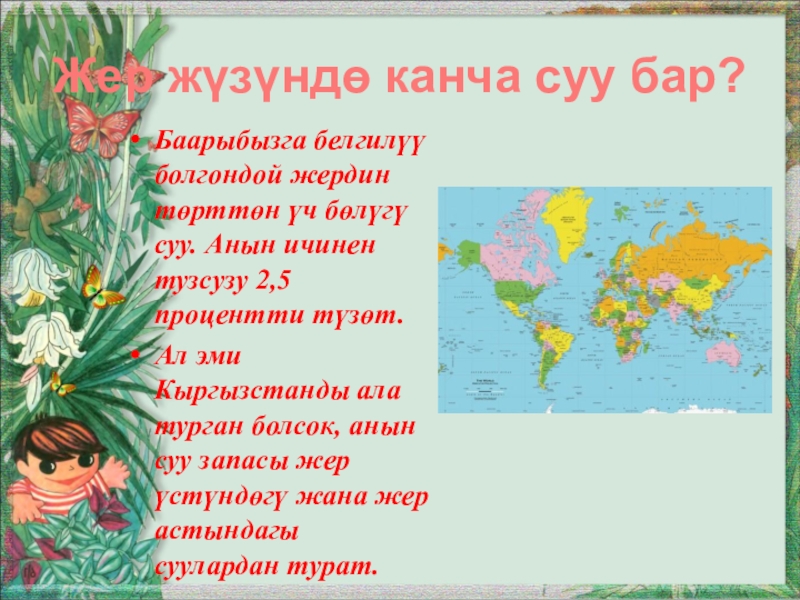 Баарыбызга белгилүү болгондой жердин төрттөн үч бөлүгү