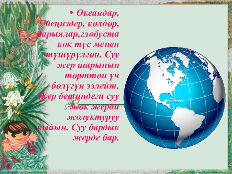 Слайд 7Океандар, деңиздер, көлдөр, дарыялар,глобуста көк түс менен түшүрүлгөн. Суу жер шарынын
