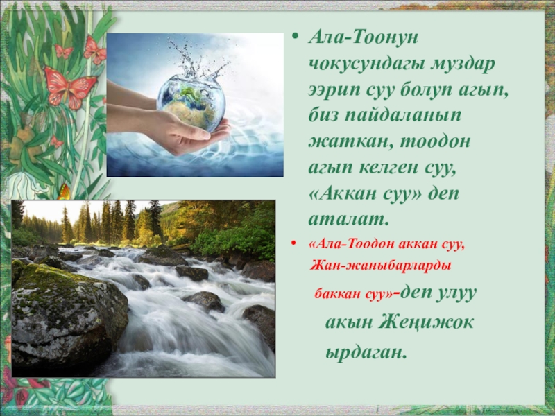 Слайд 24Ала-Тоонун чокусундагы муздар ээрип суу болуп агып, биз пайдаланып жаткан, тоодон