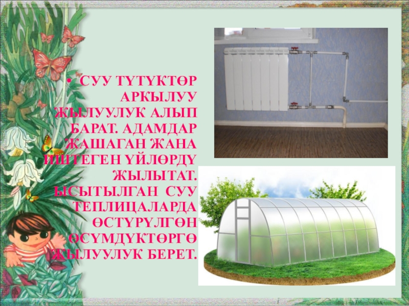Слайд 17Суу түтүктөр аркылуу жылуулук алып барат. Адамдар жашаган жана иштеген үйлөрдү