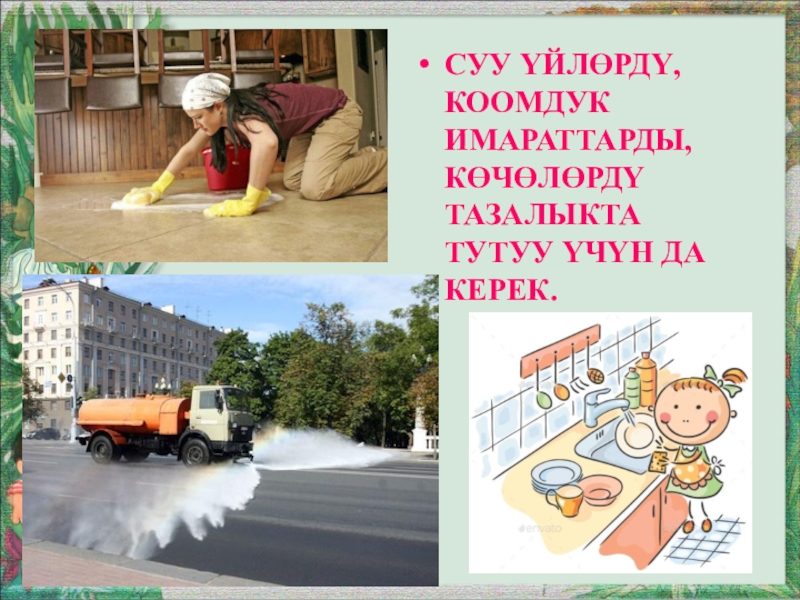 Слайд 14Суу үйлөрдү, коомдук имараттарды, көчөлөрдү тазалыкта тутуу үчүн да керек.