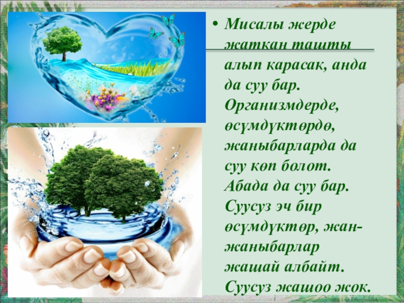 Слайд 8Мисалы жерде жаткан ташты алып карасак, анда да суу бар. Организмдерде,