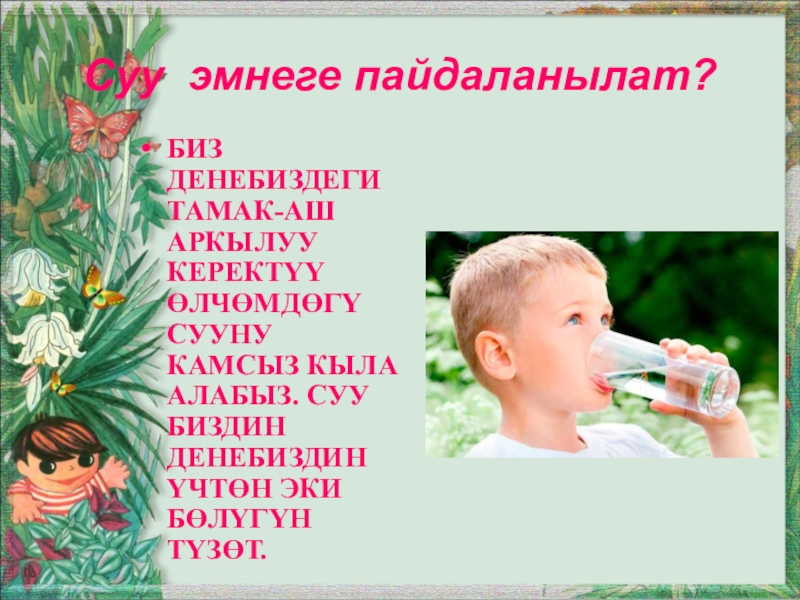 Слайд 13Суу эмнеге пайдаланылат?