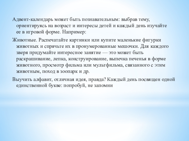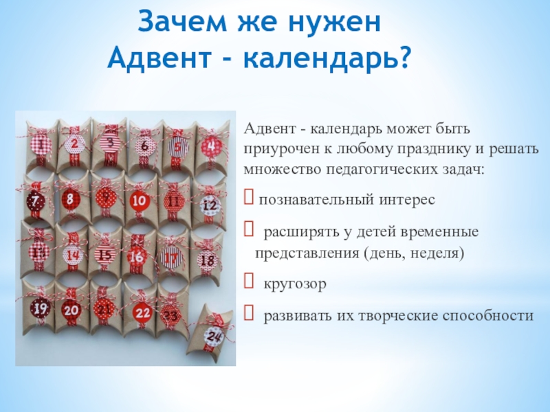 Слайд 7Адвент-календарь может быть познавательным: выбрав тему, ориентируясь на возраст и интересы детей и каждый