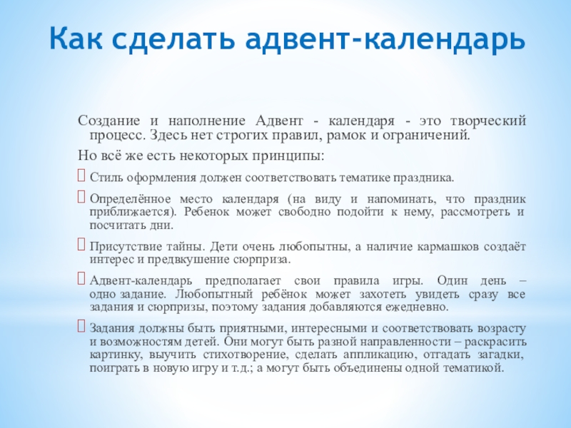 Адвент-календарь предполагает свои правила игры. Один день – одно задание. Любопытный ребёнок может захотеть увидеть сразу все задания и сюрпризы, поэтому задания добавляются ежедневно.