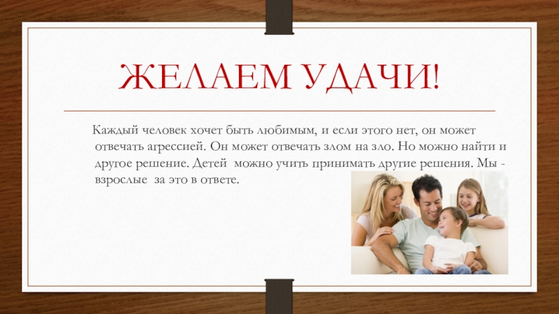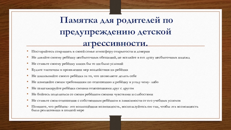 Слайд 13 Памятка для родителей по предупреждению детской агрессивности.