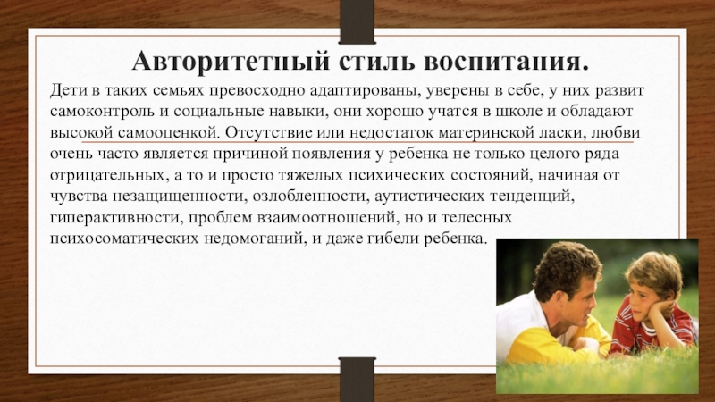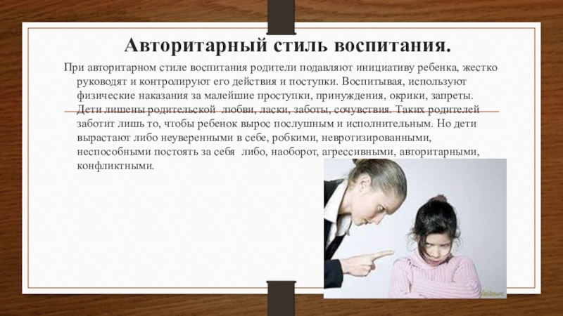 При авторитарном стиле воспитания родители подавляют инициативу ребенка, жестко руководят и контролируют его действия и поступки. Воспитывая, используют физические наказания за малейшие проступки, принуждения, окрики, запреты. Дети лишены родительской любви, ласки, заботы, сочувствия. Таких родителей заботит лишь то, чтобы ребенок вырос послушным и исполнительным. Но дети вырастают либо неуверенными в себе, робкими, невротизированными, неспособными постоять за себя либо, наоборот, агрессивными, авторитарными, конфликтными.