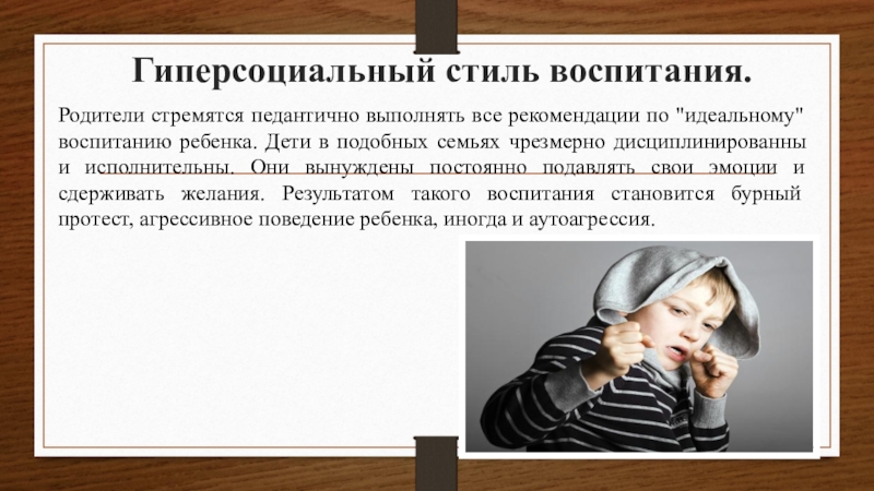 ребенка. Дети в подобных семьях чрезмерно дисциплинированны и исполнительны. Они вынуждены постоянно подавлять свои эмоции и сдерживать желания. Результатом такого воспитания становится бурный протест, агрессивное поведение ребенка, иногда и аутоагрессия.