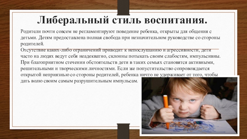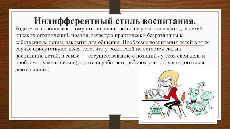 детей никаких ограничений, правил, зачастую практически безразличны к собственным детям, закрыты для общения. Проблемы воспитания детей в этом случае присутствуют из-за того, что у родителей не остается сил на воспитание детей, в семье — сосуществование с позиций «у тебя свои дела и проблемы, у меня свои» (родители работают, ребенок учится, у каждого своя деятельность).