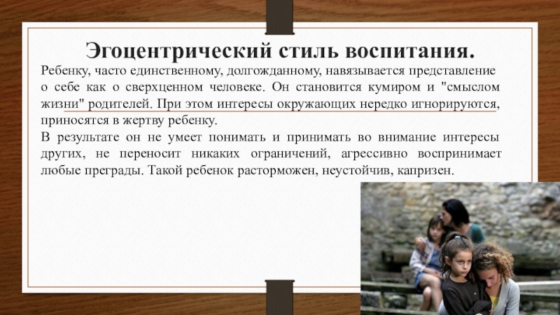 о сверхценном человеке. Он становится кумиром и "смыслом жизни" родителей. При этом интересы окружающих нередко игнорируются, приносятся в жертву ребенку.