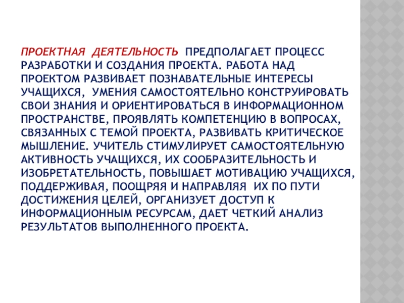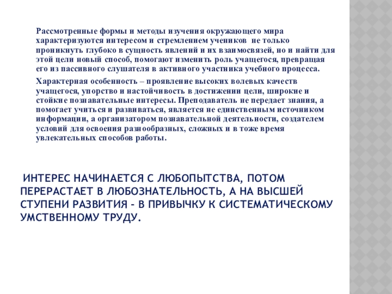 Характерная особенность – проявление высоких волевых качеств учащегося, упорство и настойчивость в достижении цели, широкие и стойкие познавательные интересы. Преподаватель не передает знания, а помогает учиться и развиваться, является не единственным источником информации, а организатором познавательной деятельности, создателем условий для освоения разнообразных, сложных и в тоже время увлекательных способов работы.