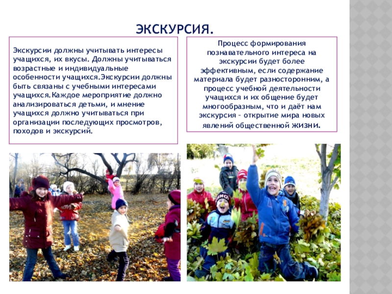 Процесс формирования познавательного интереса на экскурсии будет более эффективным, если содержание материала будет разносторонним, а процесс учебной деятельности учащихся и их общение будет многообразным, что и даёт нам экскурсия – открытие мира новых явлений общественной жизни.