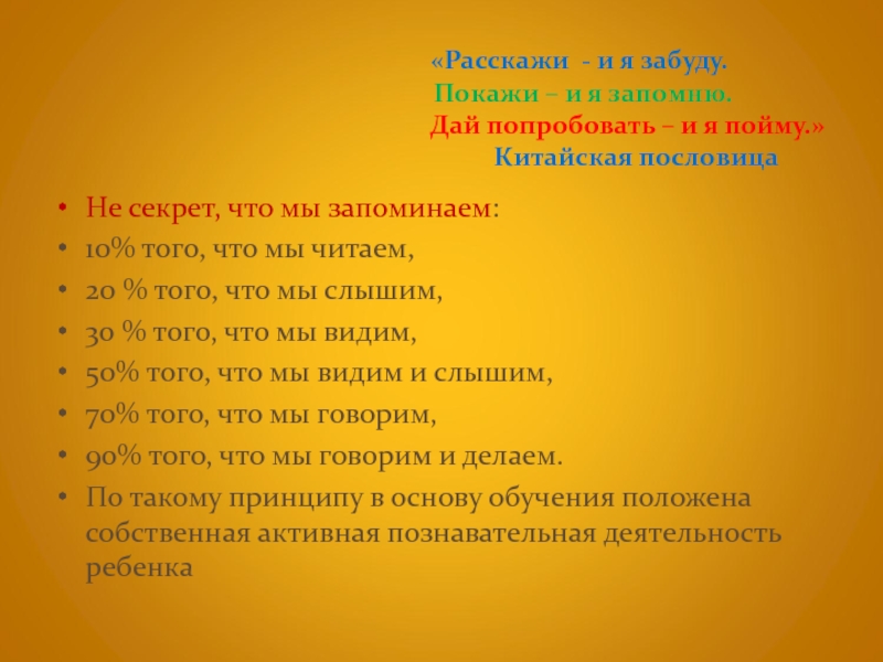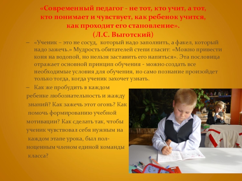 «Ученик – это не сосуд, который надо заполнить, а факел, который надо зажечь.» Мудрость обитателей степи гласит: «Можно привести коня на водопой, но нельзя заставить его напиться». Эта пословица отражает основной принцип обучения - можно создать все необходимые условия для обучения, но само познание произойдет только тогда, когда ученик захочет узнать.