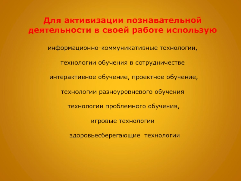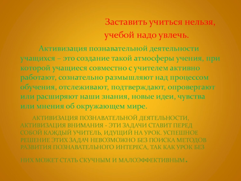 Активизация познавательной деятельности учащихся – это создание такой атмосферы учения, при которой учащиеся совместно с учителем активно работают, сознательно размышляют над процессом обучения, отслеживают, подтверждают, опровергают или расширяют наши знания, новые идеи, чувства или мнения об окружающем мире.