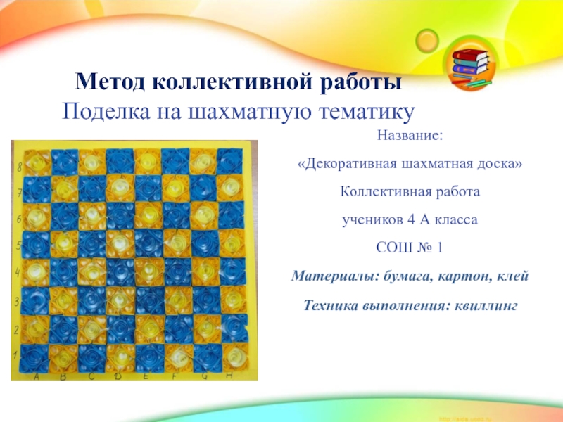 Метод коллективной работыПоделка на шахматную тематику Название: «Декоративная шахматная доска»Коллективная работа учеников 4 А класса СОШ №