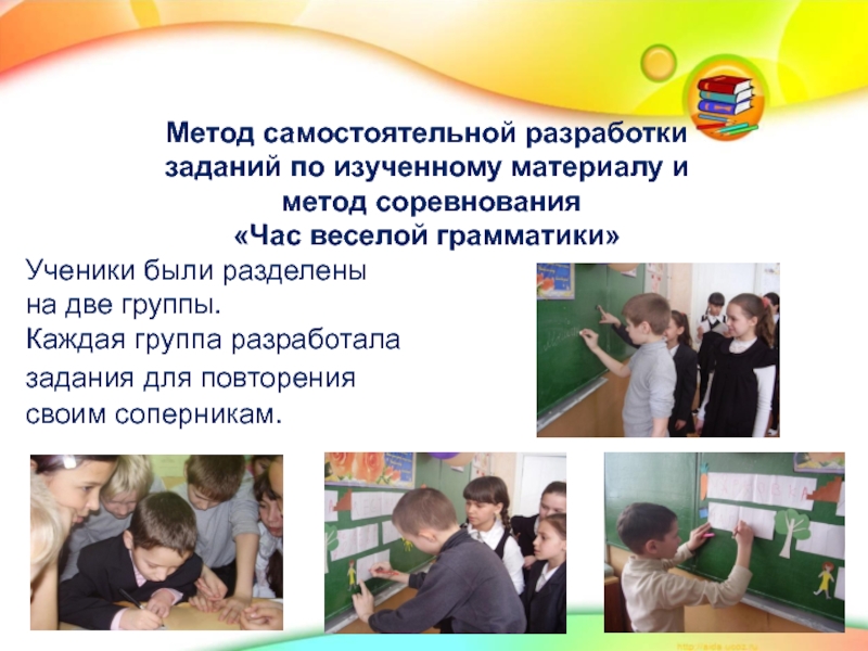 Метод самостоятельной разработки заданий по изученному материалу и метод соревнования«Час веселой грамматики»Ученики были разделены на две группы.