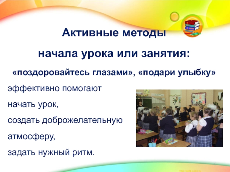 Активные методы начала урока или занятия:«поздоровайтесь глазами», «подари улыбку»эффективно помогают начать урок, создать доброжелательную атмосферу, задать нужный