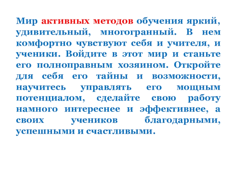 Слайд 24Мир активных методов обучения яркий, удивительный, многогранный. В нем комфортно чувствуют