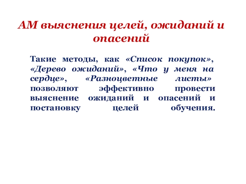 Слайд 18АМ выяснения целей, ожиданий и опасений