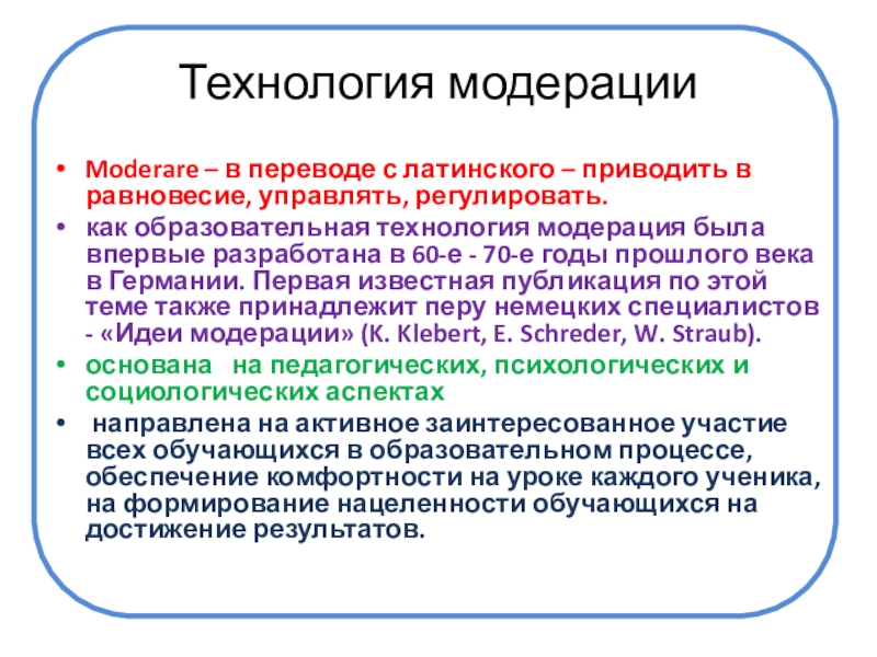 как образовательная технология модерация была впервые разработана в 60-е - 70-е годы прошлого века в Германии. Первая известная публикация по этой теме также принадлежит перу немецких специалистов - «Идеи модерации» (K. Klebert, E. Schreder, W. Straub).