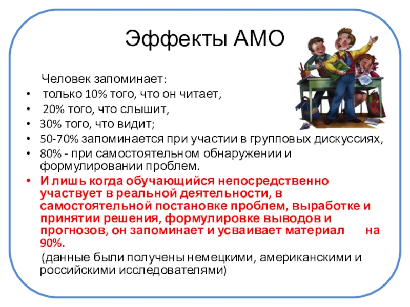 И лишь когда обучающийся непосредственно участвует в реальной деятельности, в самостоятельной постановке проблем, выработке и принятии решения, формулировке выводов и прогнозов, он запоминает и усваивает материал на 90%.